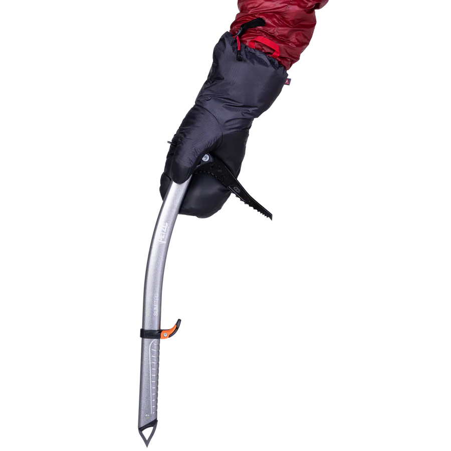 Presillas de transporte con mosquetón para asegurar al arnés o mochila, y correas de muñeca extraíbles para evitar pérdidas accidentales en el glaciar.