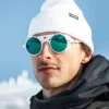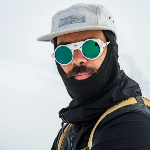 Inspirado en el diseño alpino clásico, Heron Glacier presenta protectores laterales de cuero y una pieza central desmontable para bloquear la luz solar y proteger contra el resplandor, el polvo y el viento.