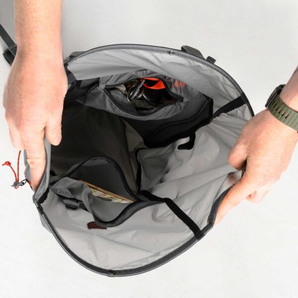 Acceso Posterior Directo: A pesar de ser una mochila roll-top, cuenta con un acceso rápido desde el panel trasero. Esto permite alcanzar equipo en el fondo de la mochila sin tener que desenrollar la parte superior.